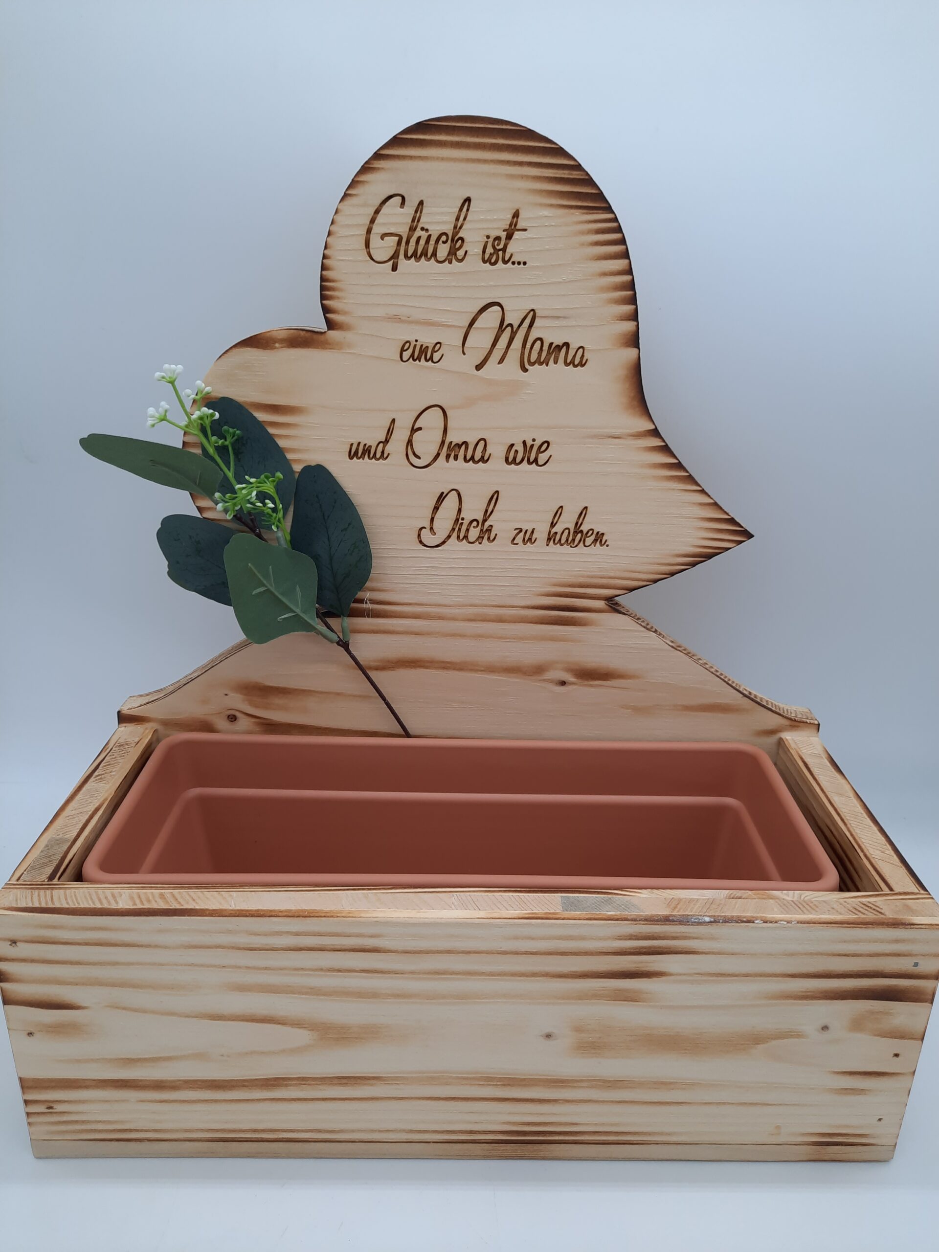 Dekoratives Blumenkisterl mit aufgesetzten Herz und Mamaspruch in einzigartigen Design, inkl. Blumeneinsatz