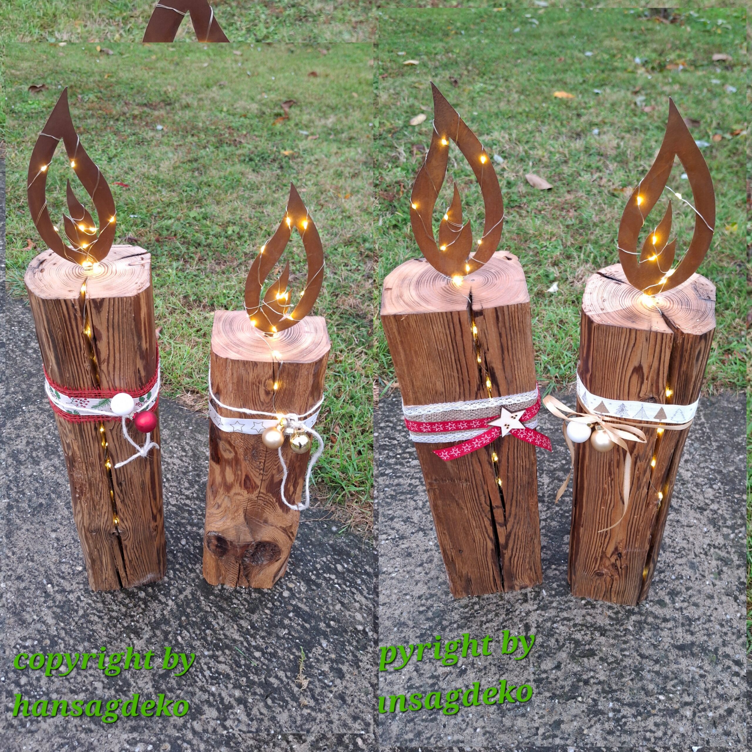 In das Holz ist eine Lichterkette mit TIMER Funktion (leuchtet für 6 Stunden) eingebohrt.