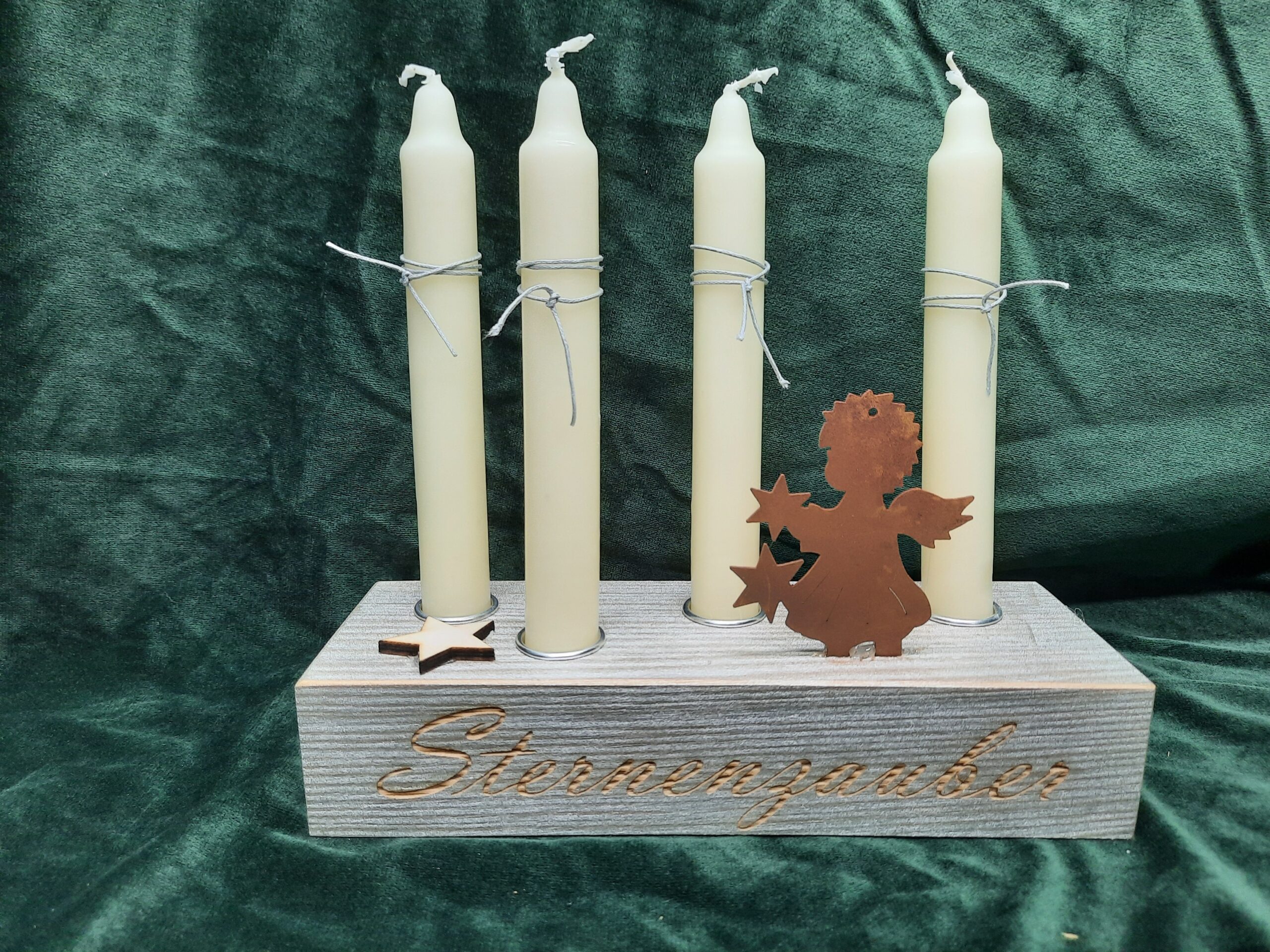 Der Holzblock ist in Silber lackiert und mit dem Text Sternenzauber graviert.