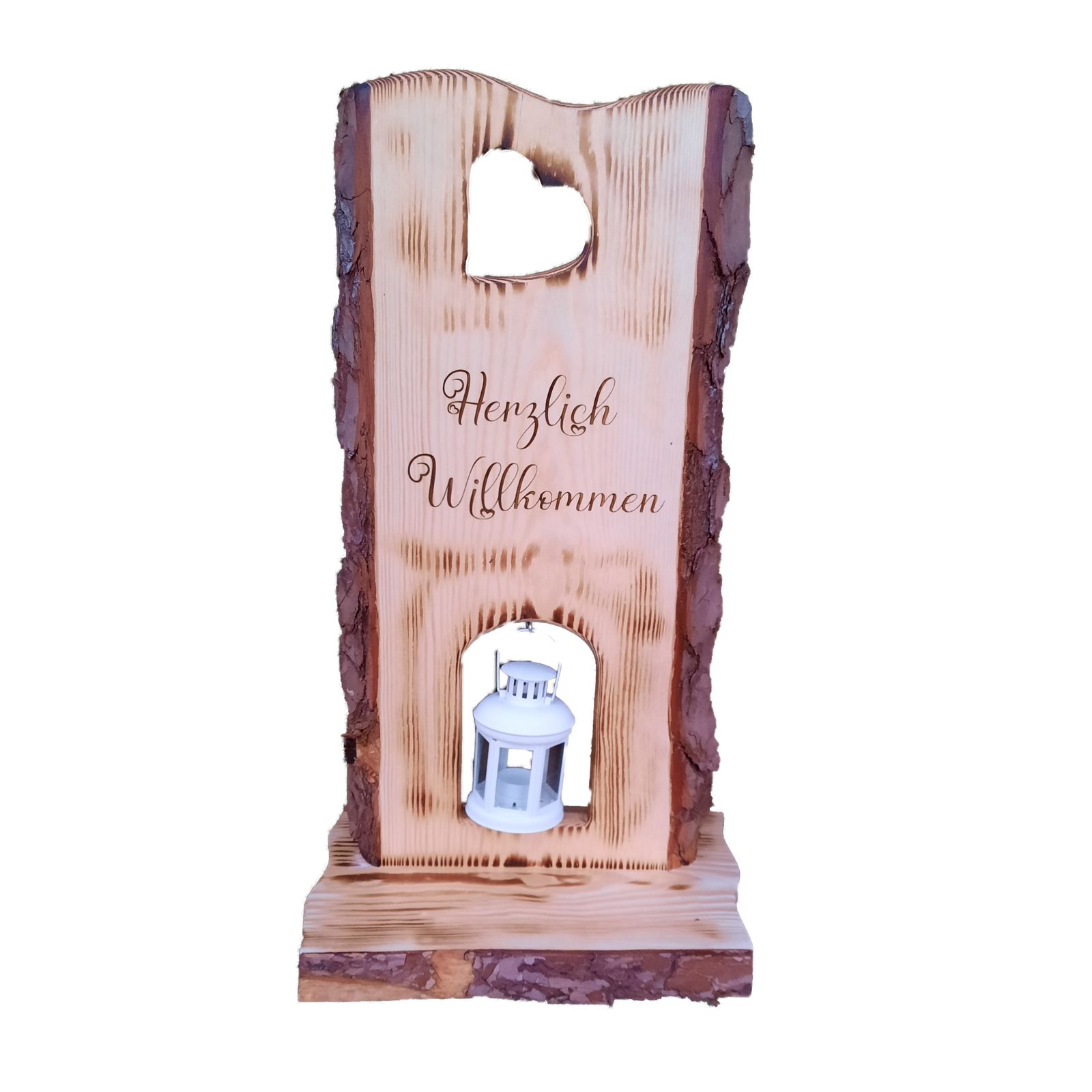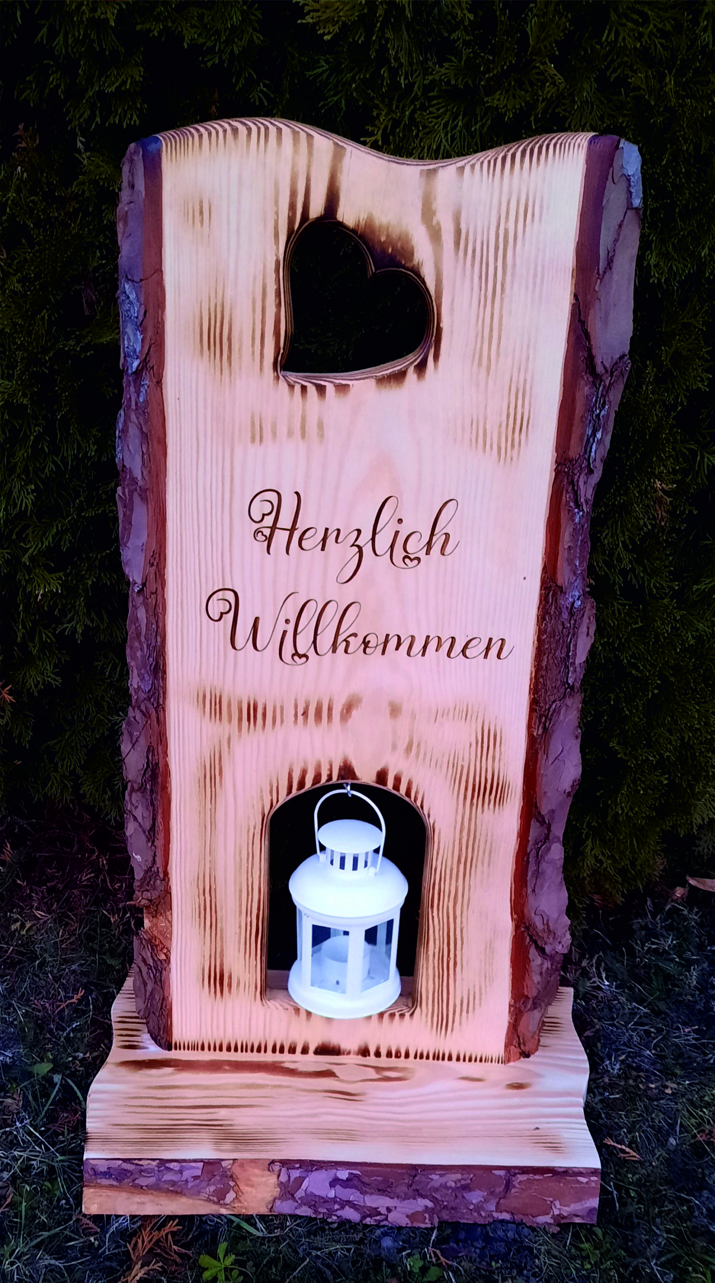 Diese Säule mit aufgesetzten Herz und der Gravur: Herzlich Willkommen und einer Laterne