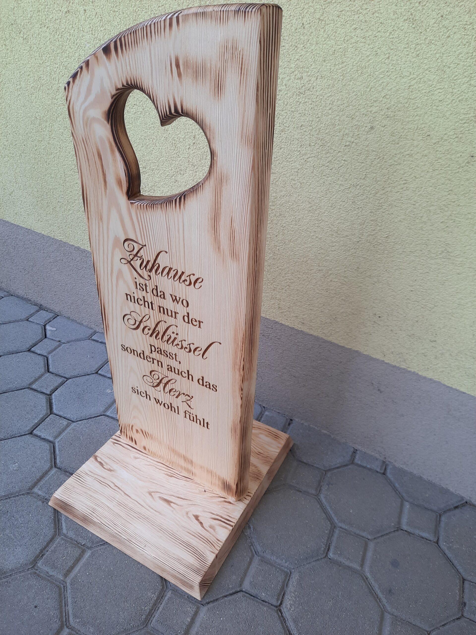 Holzsteher aus Kiefernholz mit Herzausschnitt und Familienspruch