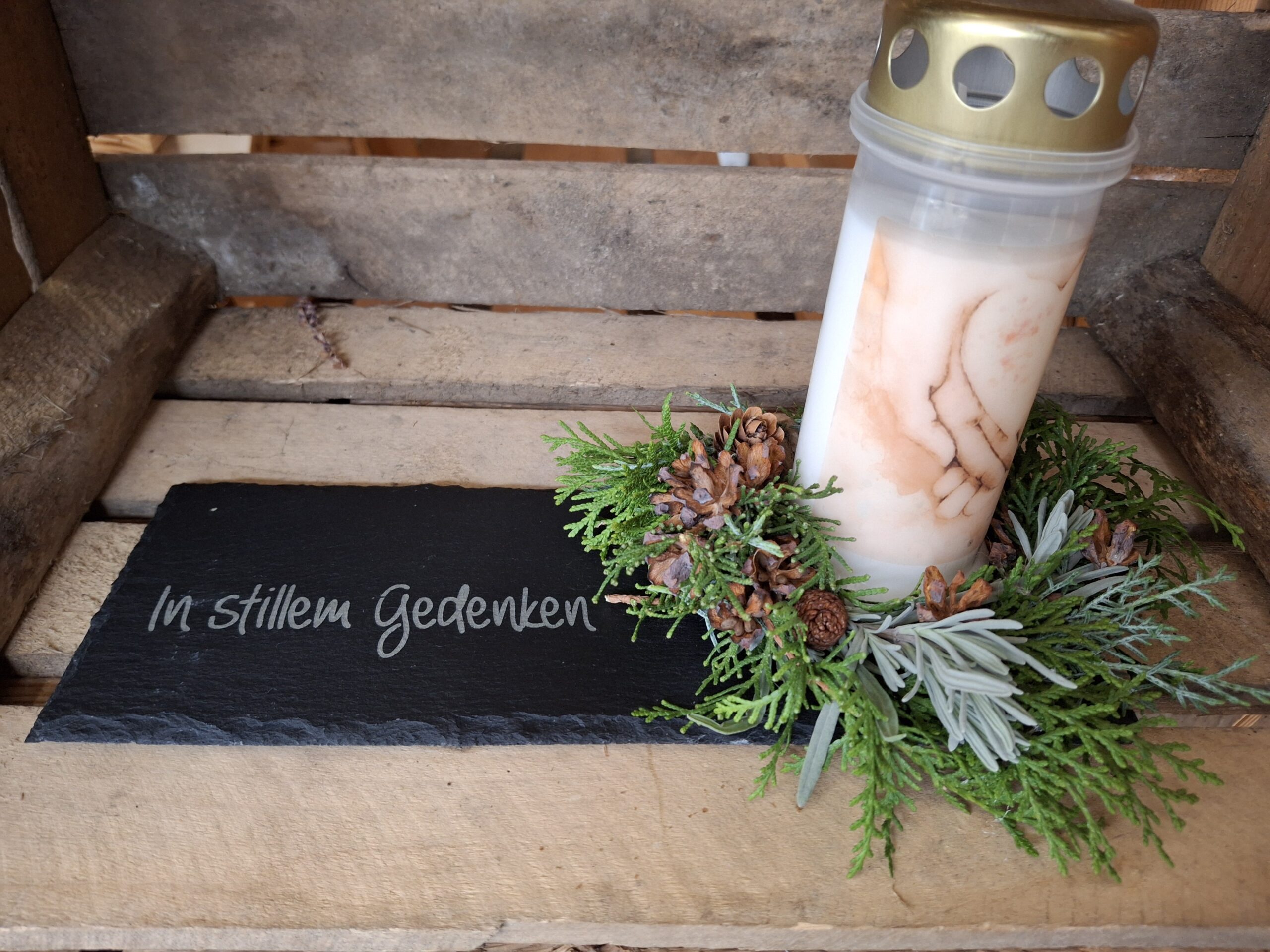 Liebevoll gestaltete Schiefer Grabuntersetzer für Kerze oder/und kleine Gestecke.
